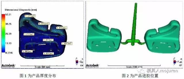 此產品為汽車安全帶(dài)固定件: 產品最大外形尺寸:70*45*63,產品平均肉(ròu)厚:1.8~7.0mm,產(chǎn)品肉厚差異較大,因此采用3D網格分析,如圖1所示。材(cái)料:ABS+PA6-GF8 Terblend N NG-02 : BASF .此材料已做(zuò)修正,質量指示器為(wéi)銀級,此材料可信(xìn)度較(jiào)高。 模具為一模兩件,由於產品量大,因此進膠方式為冷流道隧道澆口進膠,如圖2所示。