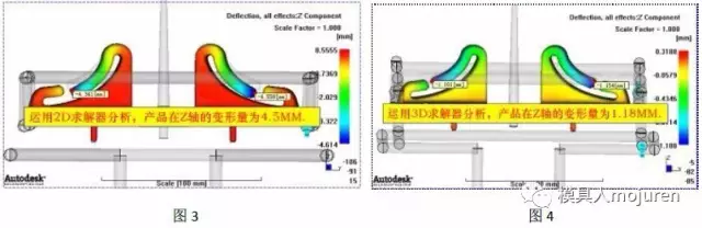 此產品雖有拐角(jiǎo),但不可使用雙(shuāng)層(céng)麵網格含有拐角效(xiào)應的選項進行分析(xī),由於此產品的形狀、壁厚分部不均且壁厚變化較大已不符合使用雙層麵網格的要求(qiú)(在(zài)這裏我用雙層麵網格分析了一下,如圖3所示。分析出的變形高達4.5MM),因此(cǐ)采用3D網格分析,分析出來的產品最大變(biàn)形為1.18MM,如圖4所示(shì)。