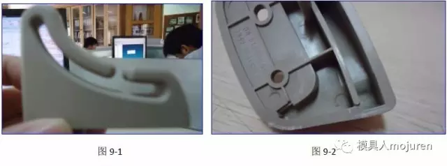 在這裏製品仍做了(le)1.2MM的反變形,澆口由原來的牛角進(jìn)膠改為現在的大水口(kǒu)搭(dā)底(dǐ)進膠,分流(liú)道改為了S形,可防止主流道及分流道 的冷料進(jìn)入模(mó)腔。實(shí)際的試模產品如(rú)圖9-1、9-2所示,產品無變形